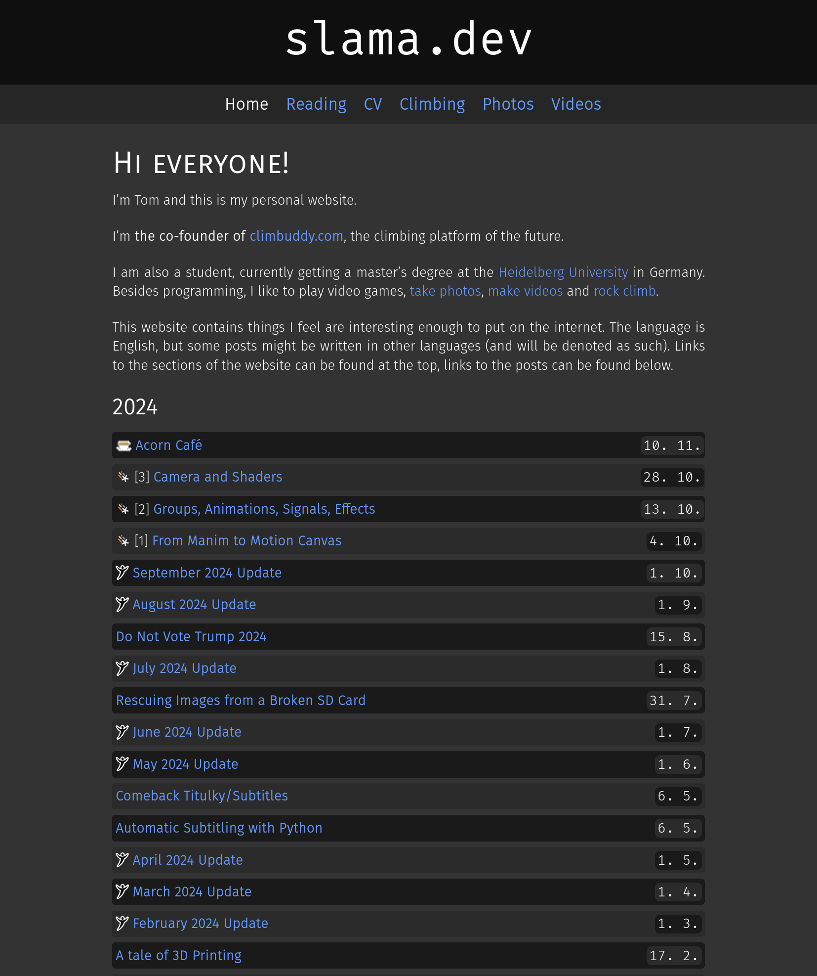 Although data files do exist in Jekyll, I didn’t make great use of them so I can’t blame this on Jekyll. Over time, however, I’ve added a few features to the website like my climbing diary, a photo gallery and even a hidden TBOI page, which are ripe for this feature.