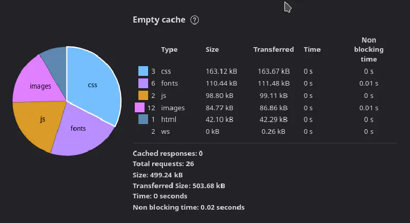 While writing the above section to boast about how fast my website is, I ran the test above and discovered, to my shock, that the website actually loads over 1 MB of data, with around 650 KB being fonts.