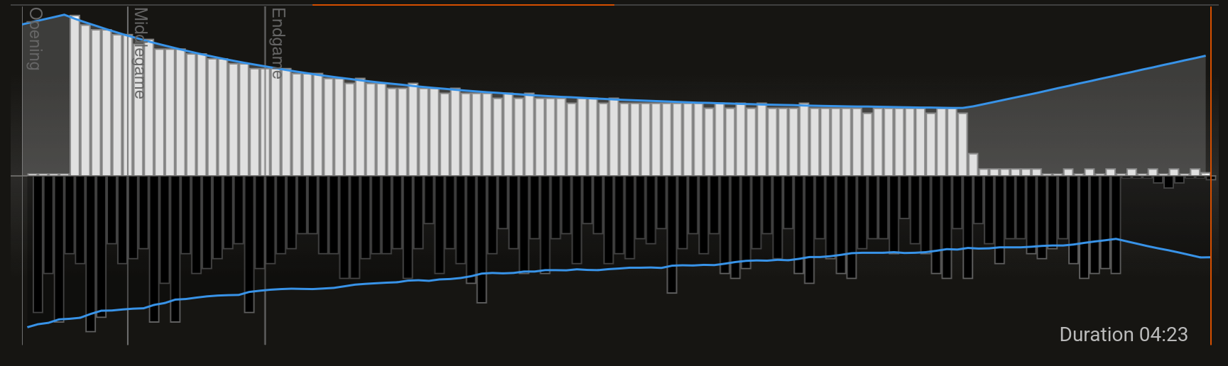 To see this in action, the image below shows the search time of an engine that doesn’t implement this (white), and an engine that does (black). Black won that game, because it’s my engine and I wouldn’t show you a loss.